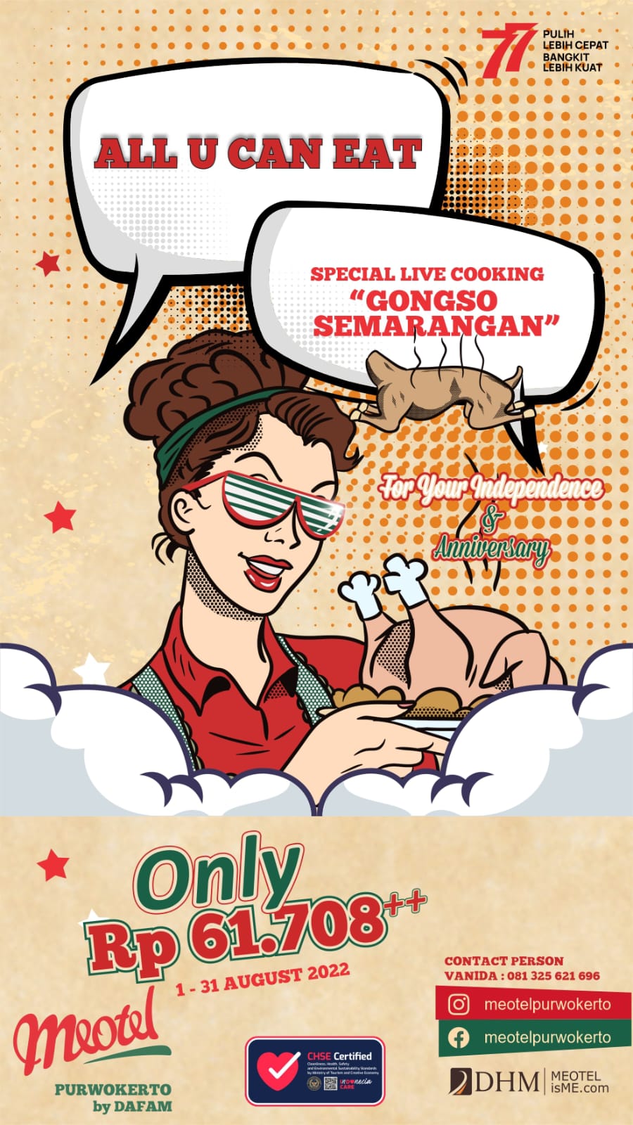 Kemudian untuk Promo Makanan dengan harga spesial yaitu Rp 61.708++ dengan nama For Your Independence & Anniversary, dimana promo tersebut merupakan All You Can Eat. Dengan harga tersebut akan mendapatkan dan menikmati banyak menu makanan special live cooking Gongso Semarang dan Gongso Ayam yang merupakan salah satu menu favorit saat promo buka puasa bersama dahulu.